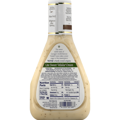 Kens Lite Sweet Vidalia Onion Dressing. Show full nutrition information. Sugar Water Apple Cider Vinegar Vegetable Oil Soybean andor Canola Distilled Vinegar Vidalia Onion 74 Contains Less than 2 of Onion Dried Modified Corn Starch Salt Potassium Sorbate Preservative Xanthan Gum Mustard Flour Natural Flavor Celery Seed Calcium Disodium EDTA to Protect Flavor.