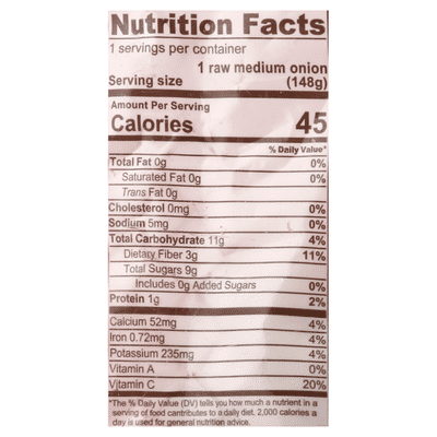 Our sweet onions are naturally. 331 669 Total Carbohydrate Total Fat 60 cal The Daily Value DV tells you how much a nutrient in a serving of food contributes to a daily diet. 2 tbsp 33g.